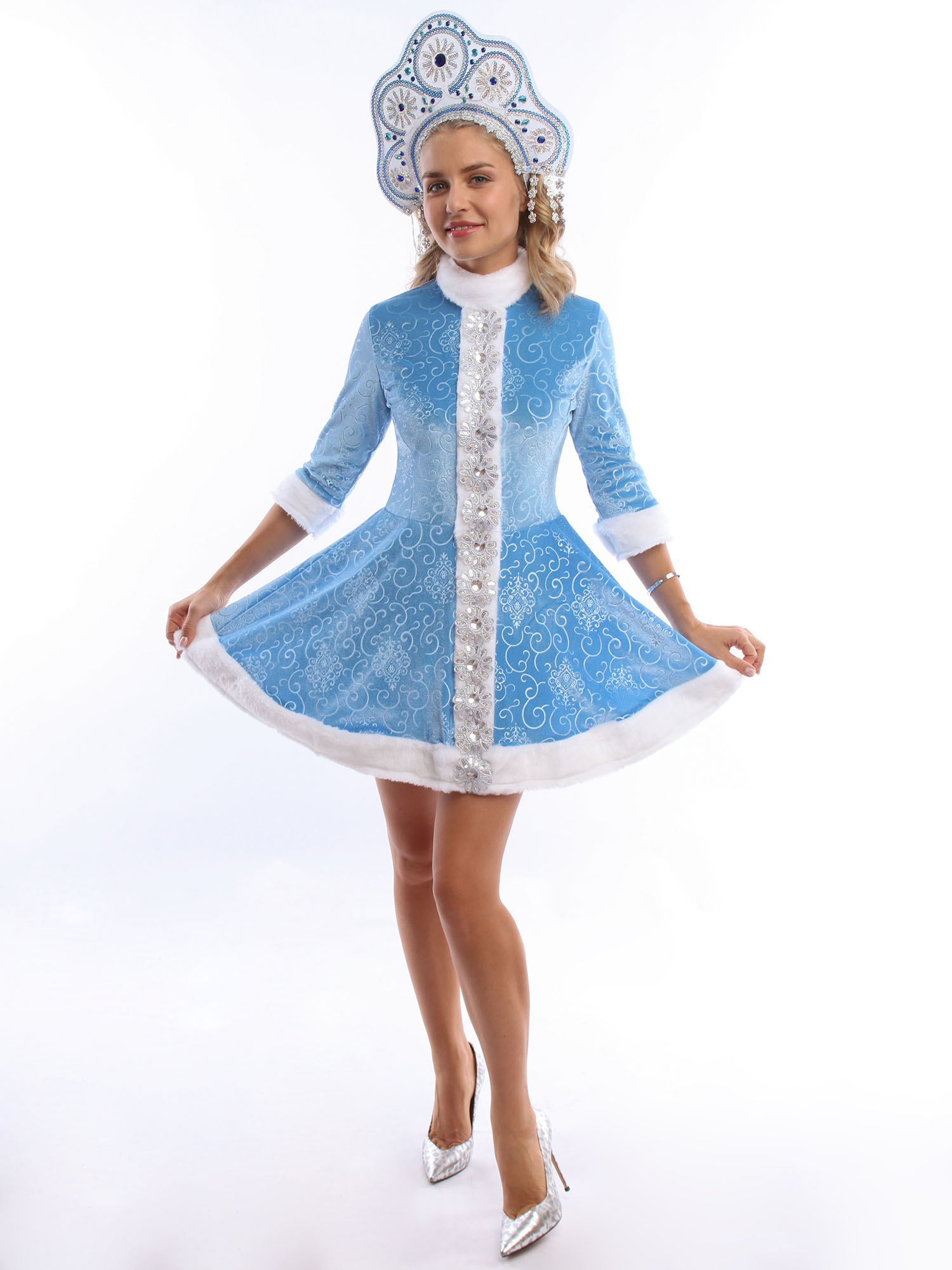 Красивый новогодний наряд для взрослых включает голубое платье и кокошник.