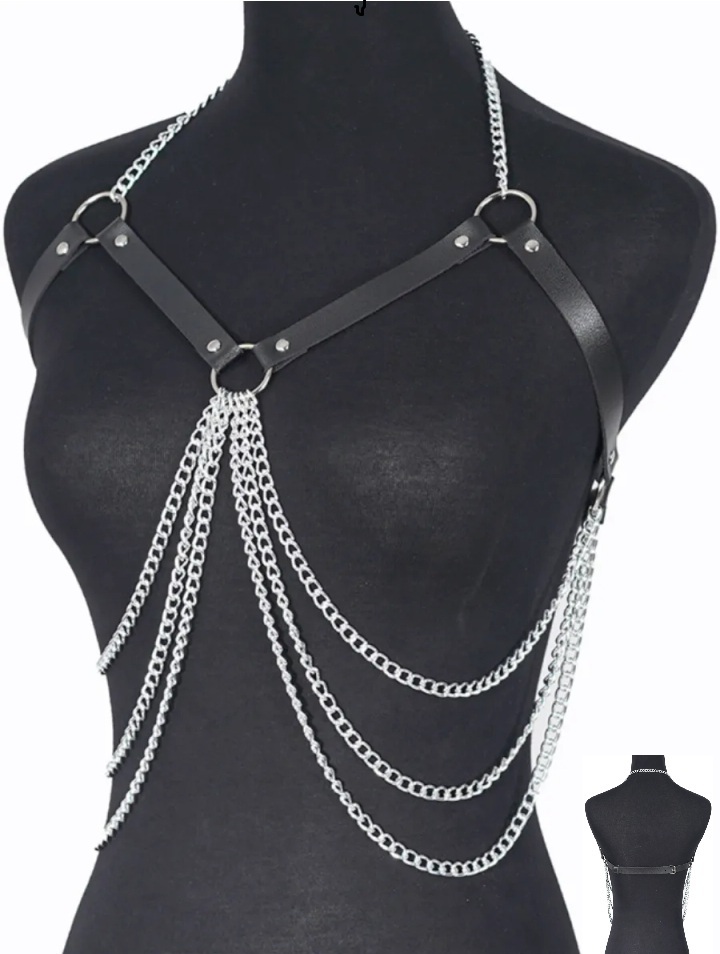 Портупея-цепи — это модный женский аксессуар, состоящий из тонких металлических цепочек, охватывающих плечи, грудь, шею и талию.
